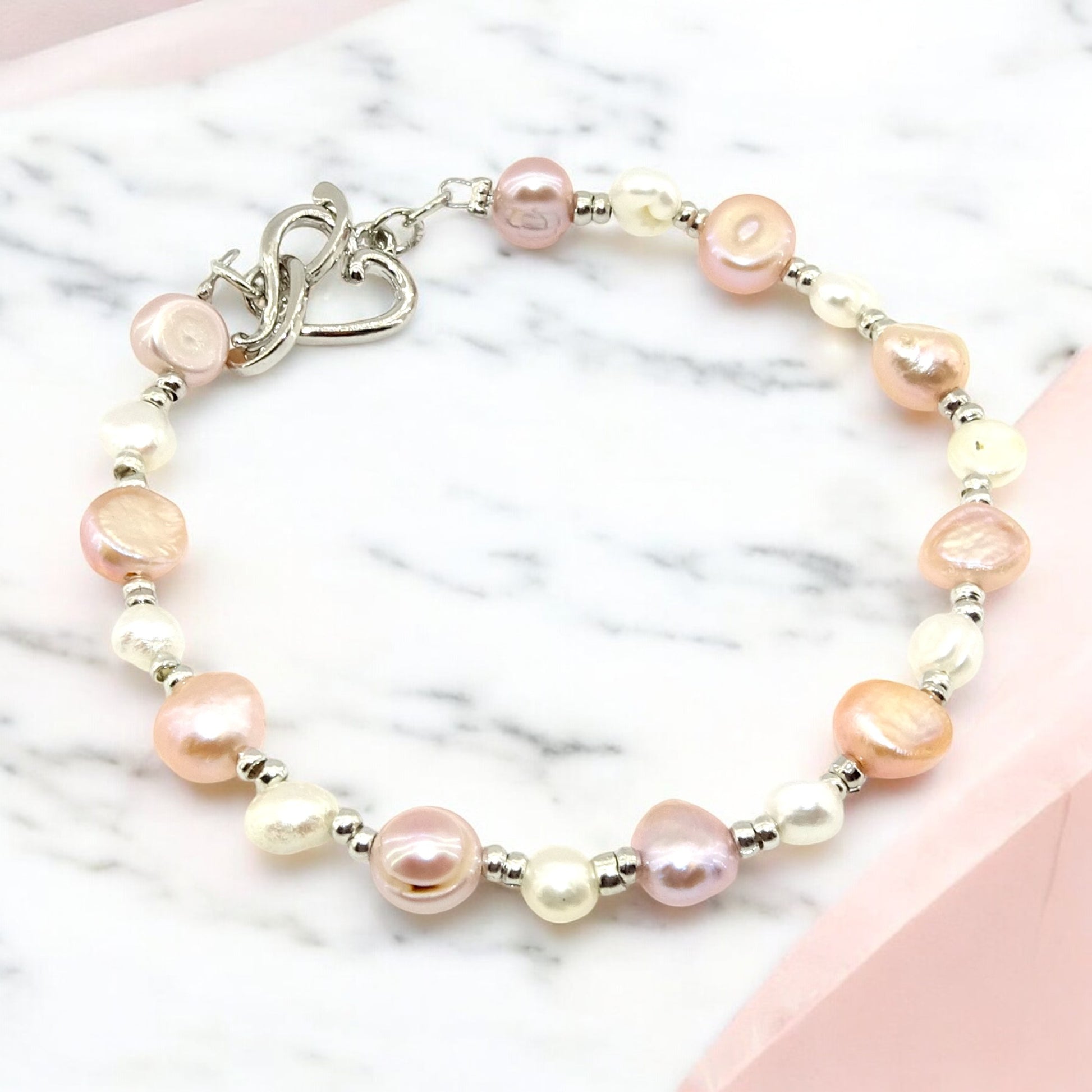 Βραχιόλι με σειρά μαργαριταριών καλλιέργειας 6-7-8,00 mm και μια όμορφη μεταλλική καρδούλα για κούμπωμα.