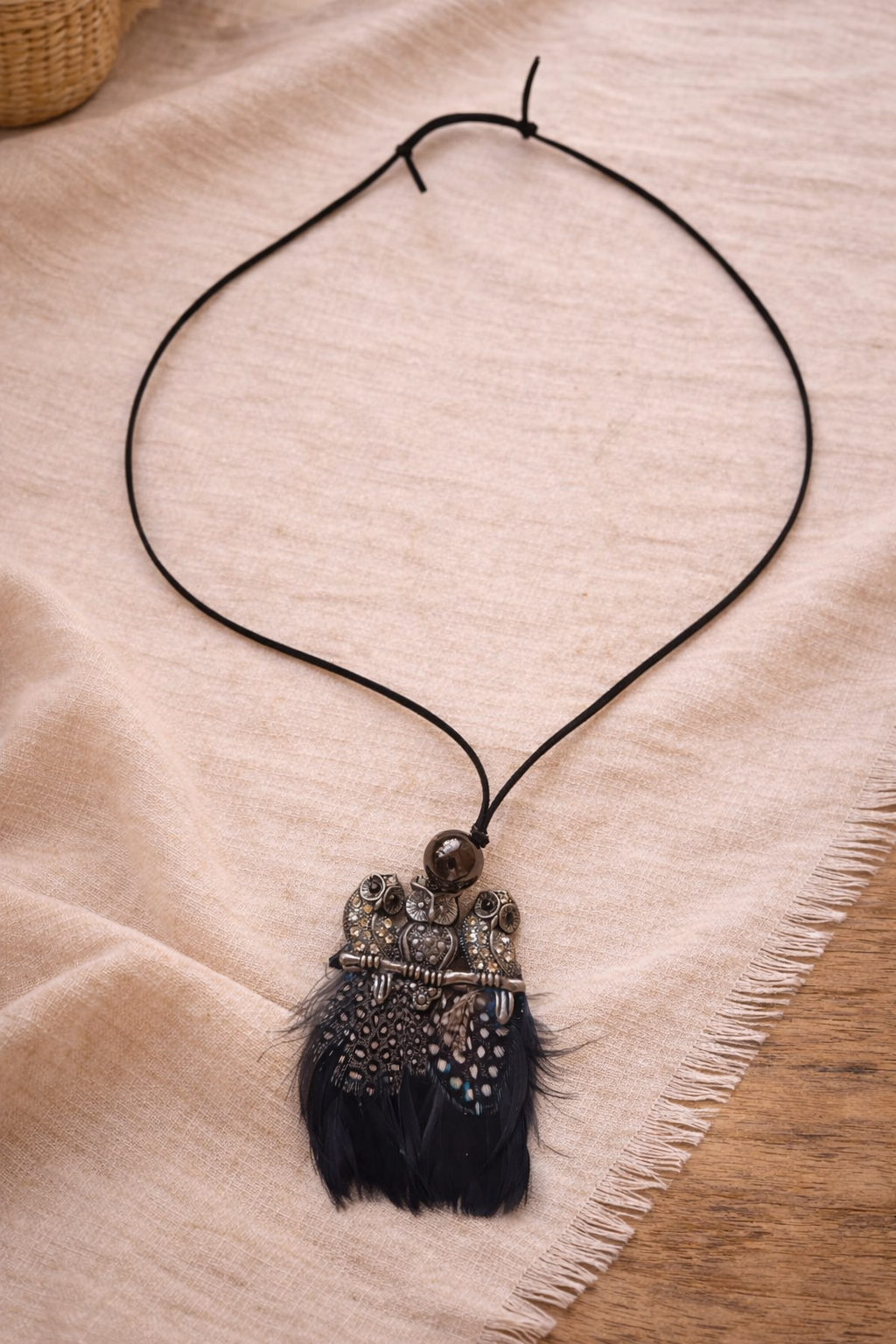 Κολιέ in corde Noctua μεταλλικό στοιχείο κουκουβάγιες και φυσικά φτερά που δίνουν κίνηση και χαρακτήρα.
