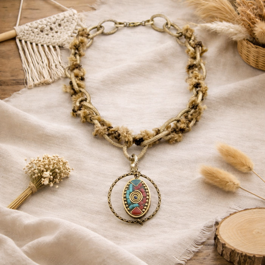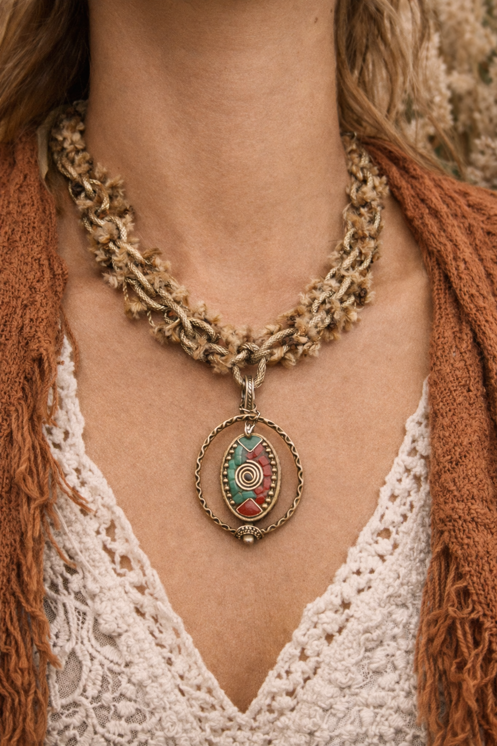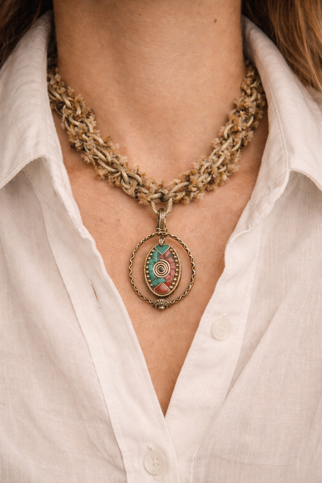 Η ιδιαίτερη αλυσίδα πλεγμένη με κορδονι σε γήινες αποχρώσεις αγκαλιάζει τον λαιμό και αναδεικνύει το μοναδικό μενταγιόν με τα χρώματα της φύσης.