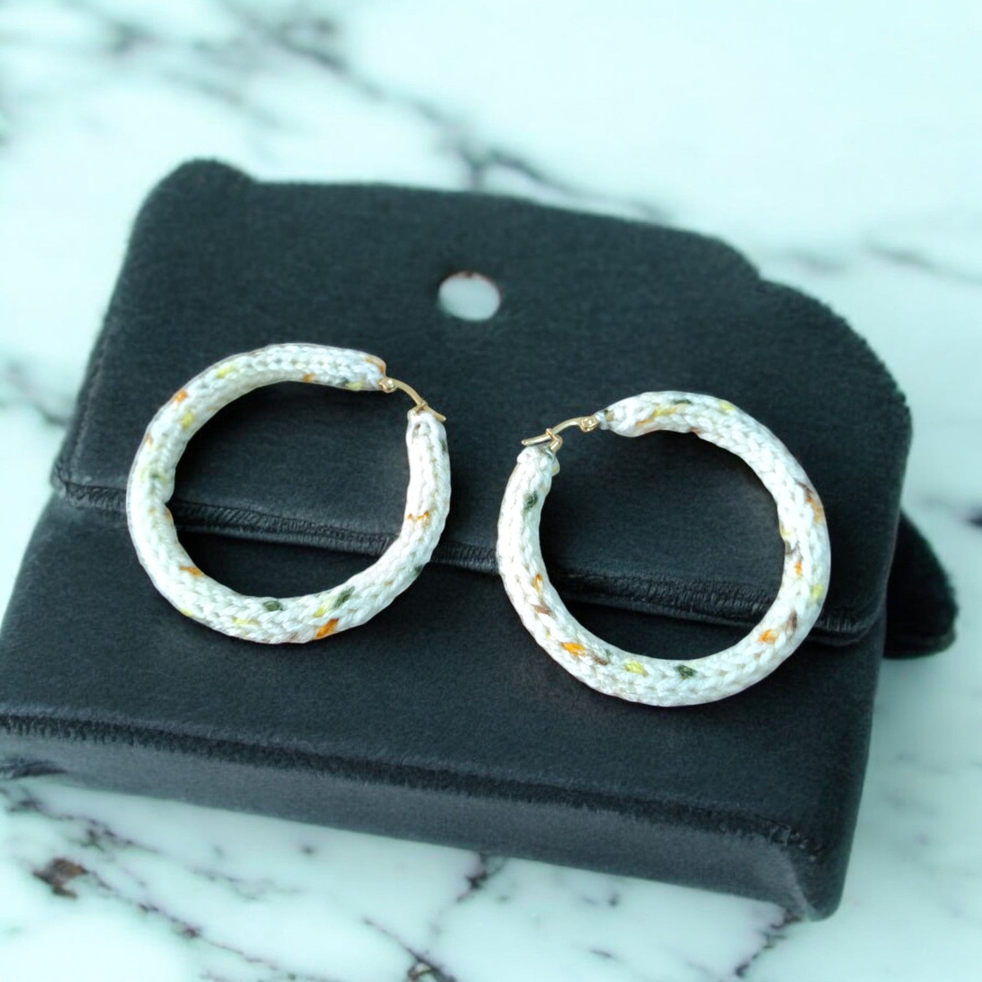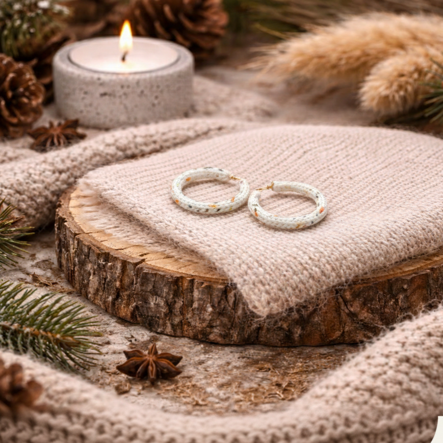 Αυτοί οι κομψοί κρίκοι είναι χειροποίητοι από πλεκτό ύφασμα σε απαλό λευκό χρώμα, διακοσμημένο με μικρές, πολύχρωμες πιτσιλιές. Η αντίθεση των χρωμάτων δημιουργεί ένα παιχνιδιάρικο και φρέσκο αποτέλεσμα, ενώ η πλεκτή υφή προσδίδει μια ζεστή και άνετη αίσθηση.