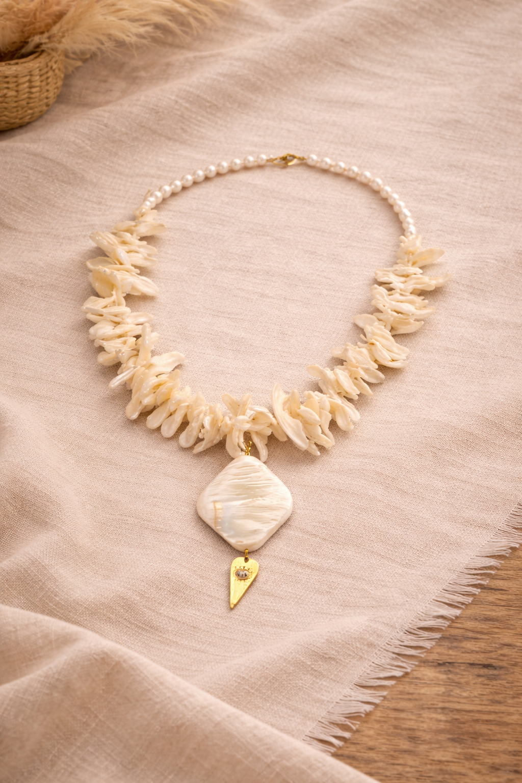 Το Ocean whisper συνδυάζει φυσικά κοχύλια με μικρές πέρλες και ένα εντυπωσιακό στοιχείο από φίλντισι που αντανακλά το φως με μοναδικό τρόπο. Η χρυσή λεπτομέρεια ολοκληρώνει το σχέδιο, δημιουργώντας ένα κόσμημα που αποπνέει κομψότητα και φυσικότητα.